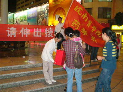5月12日,四川省汶川县发生7.8级强烈地震,汶川、北川、绵阳等地人民生命财产遭受了重大损失。一方有难,八方支援,灾难无情人有情。5月14日,药学系07级制药工程专业学生自发组织起来,带动了全系学生共同参与,在校园内,广大学生伸出援助之手,奉献一份爱心;同时,在市区步行街、美食街、嘉信茂广场设立募捐台,学生的爱心举动得到了积极响应,广大市民踊跃捐资,帮助灾区人民共度难关。仅14日晚,各募捐点共筹集爱心捐款已超过万元。