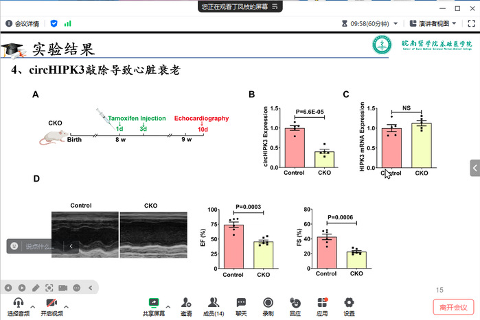 丁凤枝博士揭示了心脏衰老发生的新机制。她的研究发现,circHIPK3在心脏中高表达,但在衰老心脏中表达下调。在离体水平,过表达circHIPK3能够抑制心肌细胞衰老,而沉默circHIPK3促进心脏衰老的发生。在体水平中,敲除HIPK3基因2号外显子下游邻近的SINE序列可成功构建circHIPK3敲除小鼠。circHIPK3心肌细胞特异性敲除小鼠心功能明显下降,并出现心脏衰老现象,而外泌体能够通过递送circHIPK3改善敲除小鼠心脏功能,缓解衰老现象的发生。在机制上,circHIPK3通过加强HuR蛋白和β-TrCP泛素连接酶之间的相互作用,从而促进HuR的泛素标记,导致HuR泛素化降解增多,使衰老主要启动子p21 mRNA稳定性减弱,p21蛋白表达减少,最终发挥了心脏保护作用。丁凤枝博士的讲座内容丰富,生动有趣,给听众留下了深刻的印象。