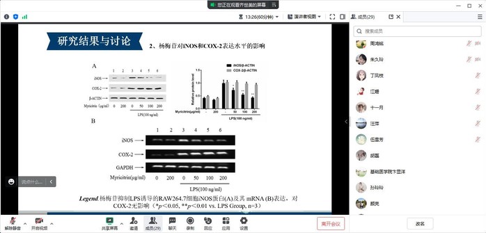 齐世美结合自己近年来科研进展及人才培养方面的工作,深入浅出地分享了杨梅苷在抗炎与抵御氧化应激方面的研究成果。她以LPS诱导产生炎症反应的小鼠巨噬细胞RAW264.7和大鼠腹腔原代巨噬细胞为研究对象,通过观察细胞中产生的促炎症因子和炎症介质及其对NOX2亚基p47phox移位与NF-κB信号通路的影响,揭示了杨梅苷发挥抗炎作用的可能分子机制。整场讲座内容丰富、层次清晰、语言生动,给与会人员留下了深刻印象。